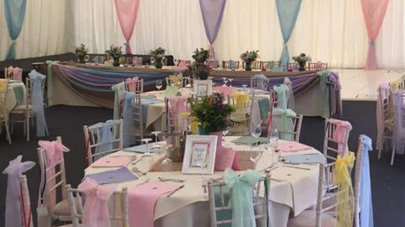 This STUNNING, luxury marquee is fully fitted with solid flooring, fitted carpet, Ivory drapes, chandeliers, leather sofa lounge, dance floor, a private bar, Loos and ladies powder room, and over 7,000 lights in its ceiling, transforms the look of the quintessential country garden marquee by day, to your perfect, elegant party tent by night!